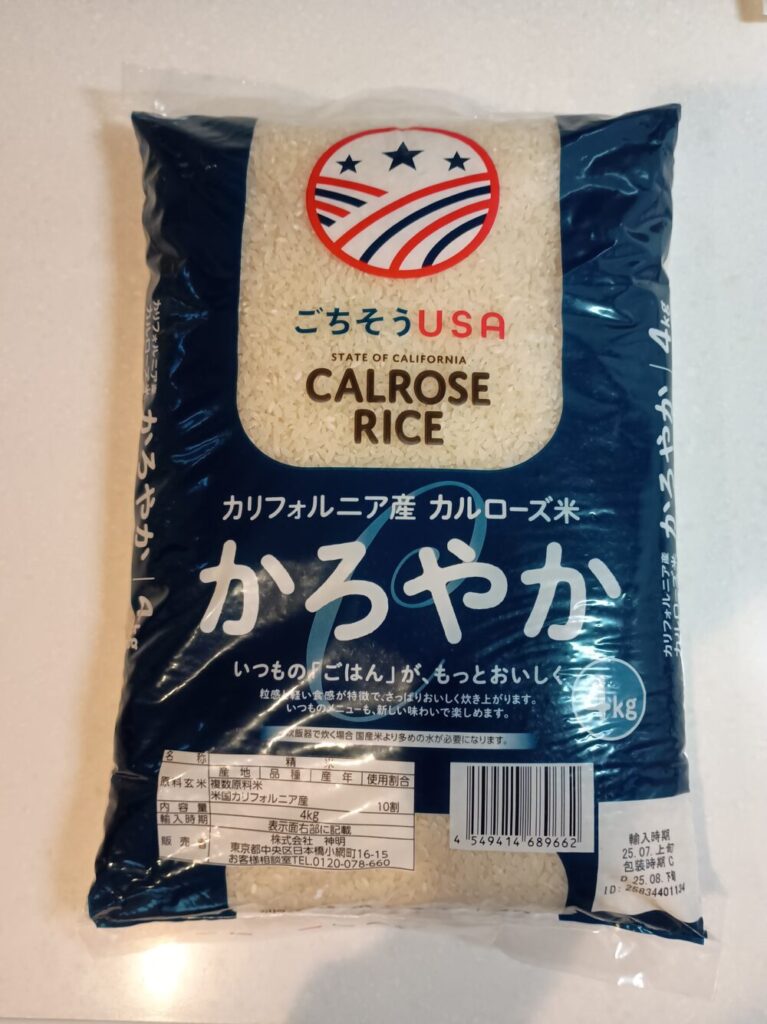 輸入米はアメリカのカルフォルニア州で栽培されたカルローズ。2025年7月上旬に輸入との表示があります。今回購入した「かろやか」というブランドは、イオングループのスーパーで販売されています。