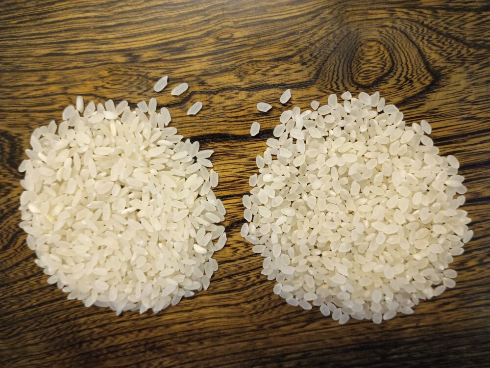 左がカルローズ、右がこしひかり。色味にほとんど違いはありませんが、カルローズのほうが粒がやや面長で大きめなのがわかります。