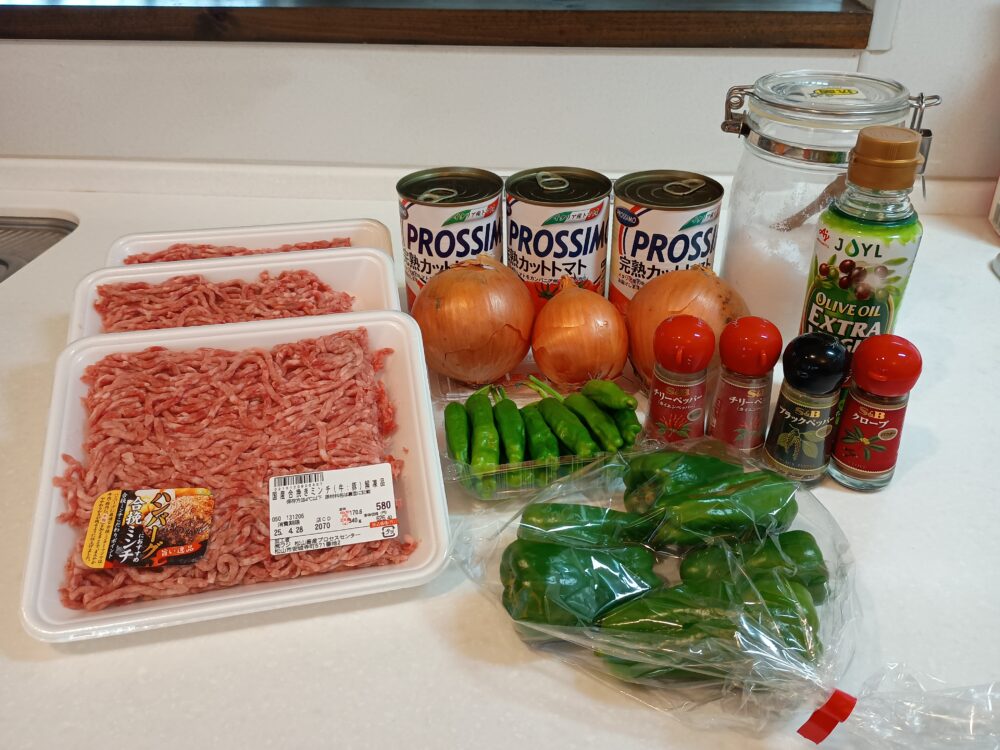 夫婦2人で夕食3回分程度の分量になります。香辛料は、チリペッパーと粗挽きコショウは必須、あとは好みで香辛料を適宜追加します。