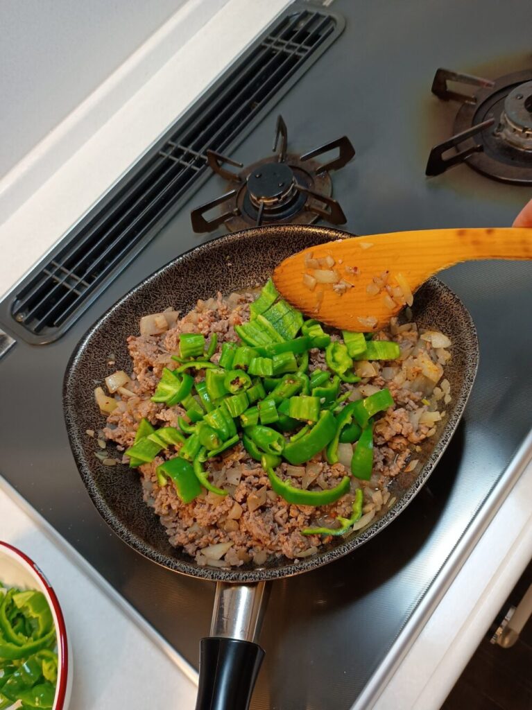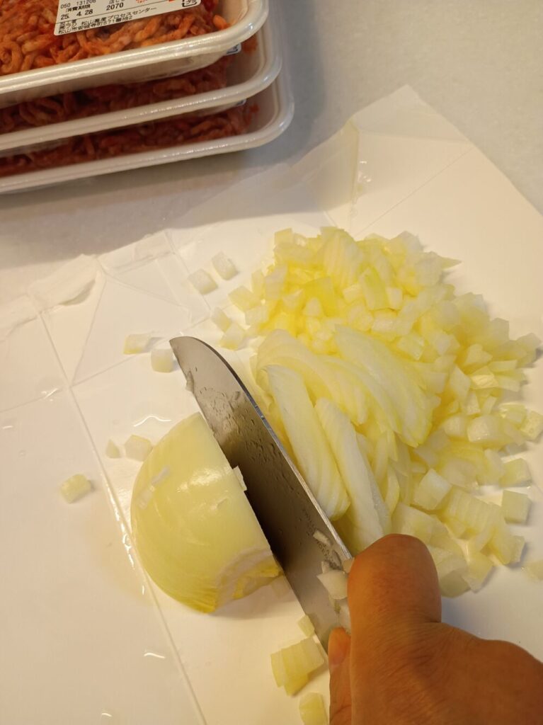 ③ タマネギがシナッとしてきたら挽き肉を入れる。