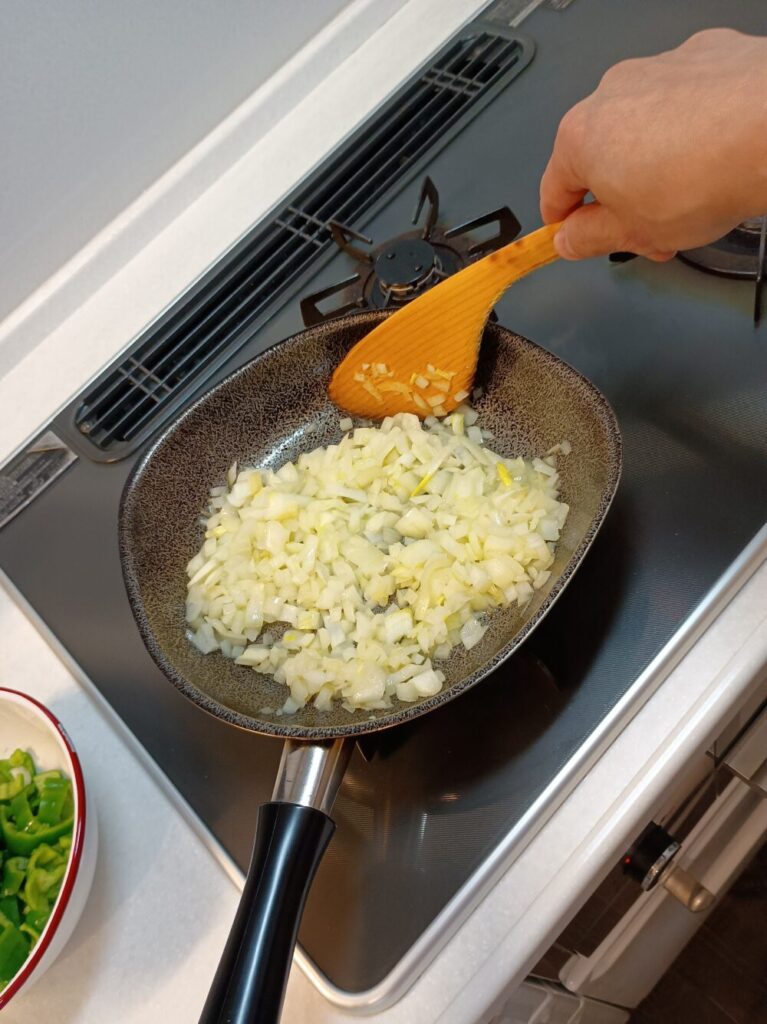 ② タマネギをオリーブオイルで炒める。