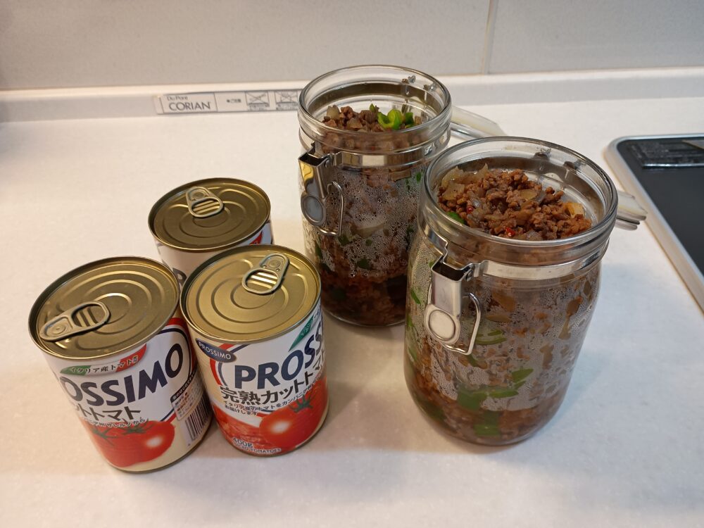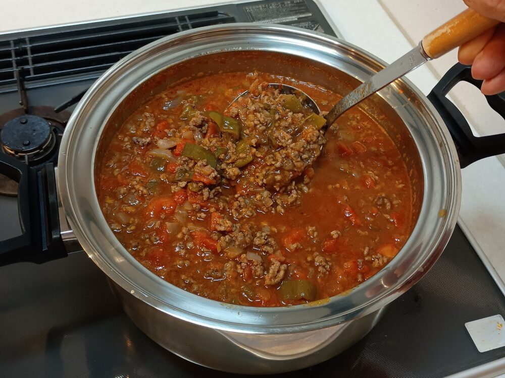 作り置き食材の保存に重宝しているガラス保存瓶です。耐熱仕様なので炒め終わった具材をそのまま入れられます。冷蔵庫で保存すれば1週間くらいは持つので、好きなときに鍋に戻してカットトマトと煮込みます。ガラス製なので変なにおいがつかず清潔感があって劣化する心配もなし。少し重たいのですが、その分本物感があって手抜き料理をしている後ろめたさも薄らぎます。